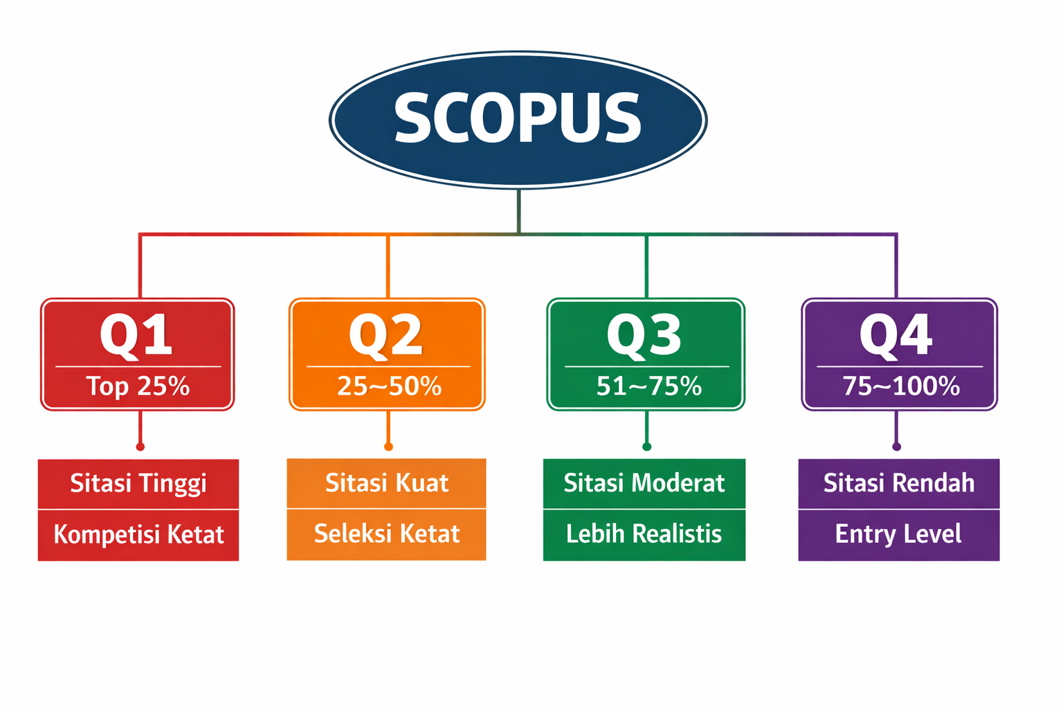 Quartile Scopus merujuk pada pengelompokan jurnal berdasarkan posisi peringkatnya dalam satu kategori bidang ilmu tertentu. Kuartil dibagi menjadi empat kelompok: Q1 (25% teratas), Q2 (25% berikutnya), Q3, dan Q4. Sistem ini bertujuan memudahkan peneliti dalam memahami posisi relatif jurnal tanpa harus membaca angka metrik secara rinci.