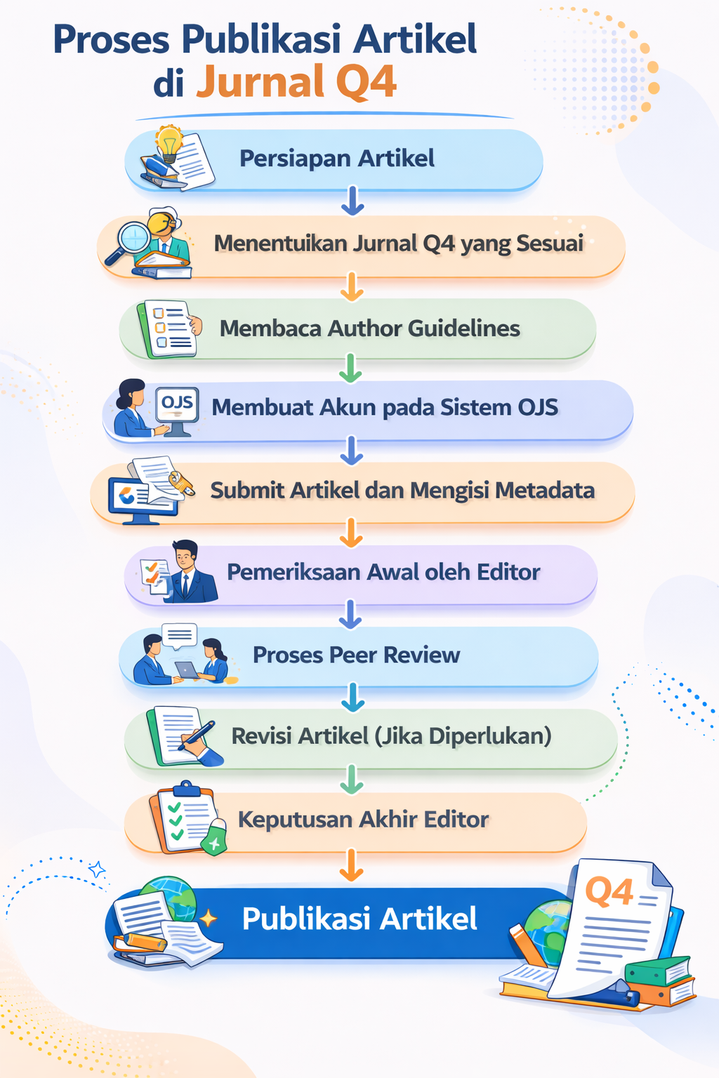 Jurnal Q4 tetap menjadi bagian dari ekosistem publikasi ilmiah internasional yang memiliki standar akademik tertentu. Meskipun berada pada kelompok kuartil terbawah dalam sistem pemeringkatan Scopus, jurnal Q4 tetap menerapkan proses editorial dan peer review yang bertujuan untuk menjaga kualitas artikel yang dipublikasikan. Oleh karena itu, proses pengiriman artikel ke jurnal Q4 tetap memerlukan persiapan yang matang agar artikel dapat melewati proses seleksi awal dan dilanjutkan ke tahap peninjauan ilmiah.