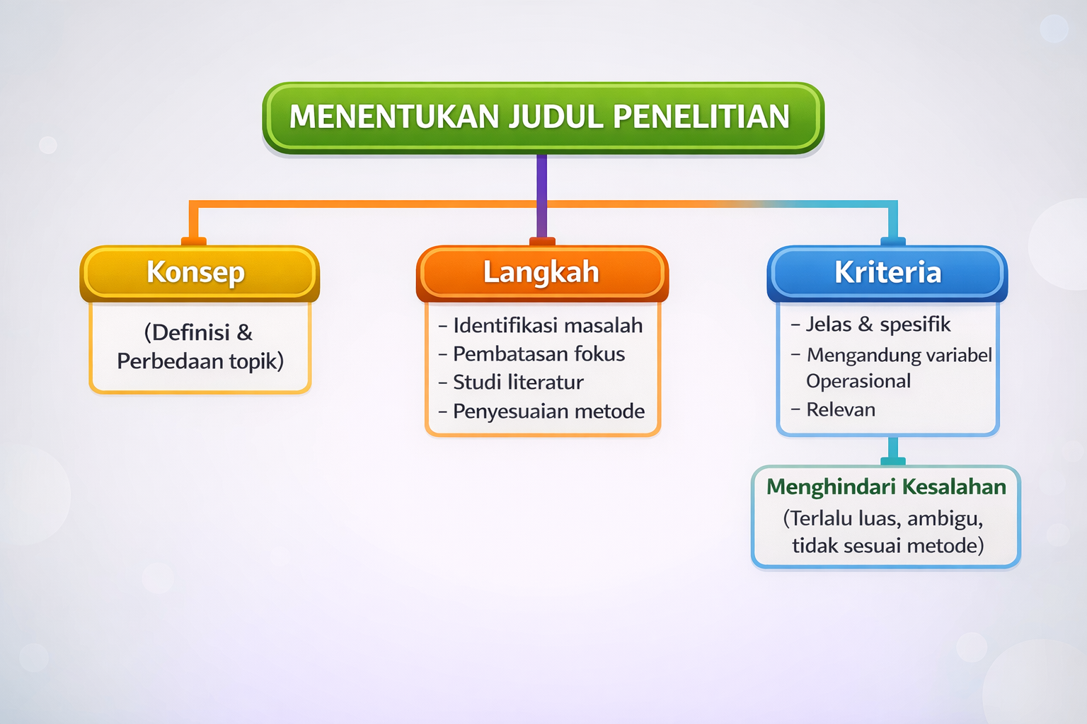 Menentukan judul penelitian yang tepat merupakan langkah fundamental dalam proses penyusunan karya ilmiah. Judul tidak hanya berfungsi sebagai identitas penelitian, tetapi juga sebagai dasar dalam menyusun rumusan masalah, tujuan, dan metode penelitian. Kejelasan dan ketepatan judul sangat memengaruhi arah serta kualitas hasil penelitian.